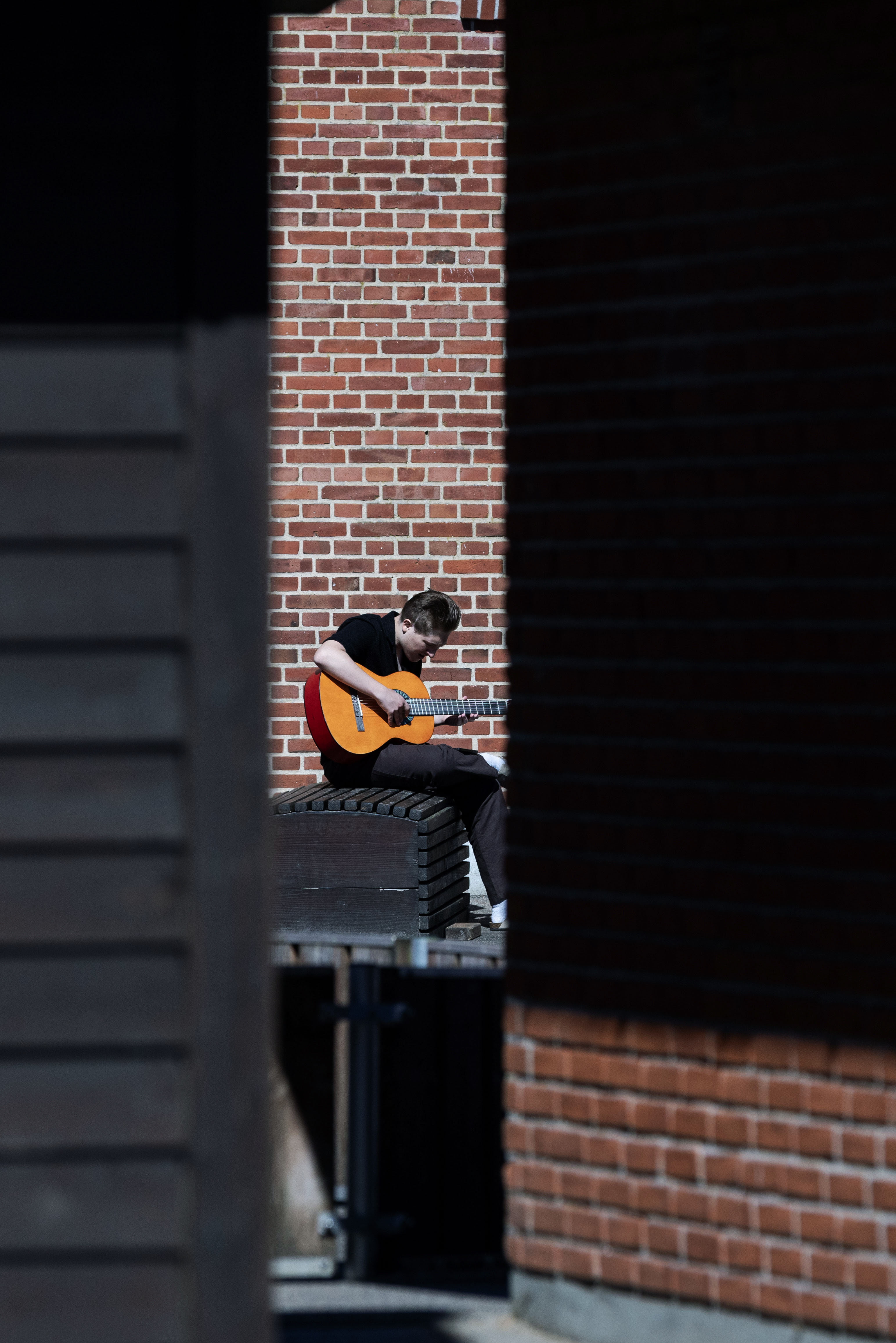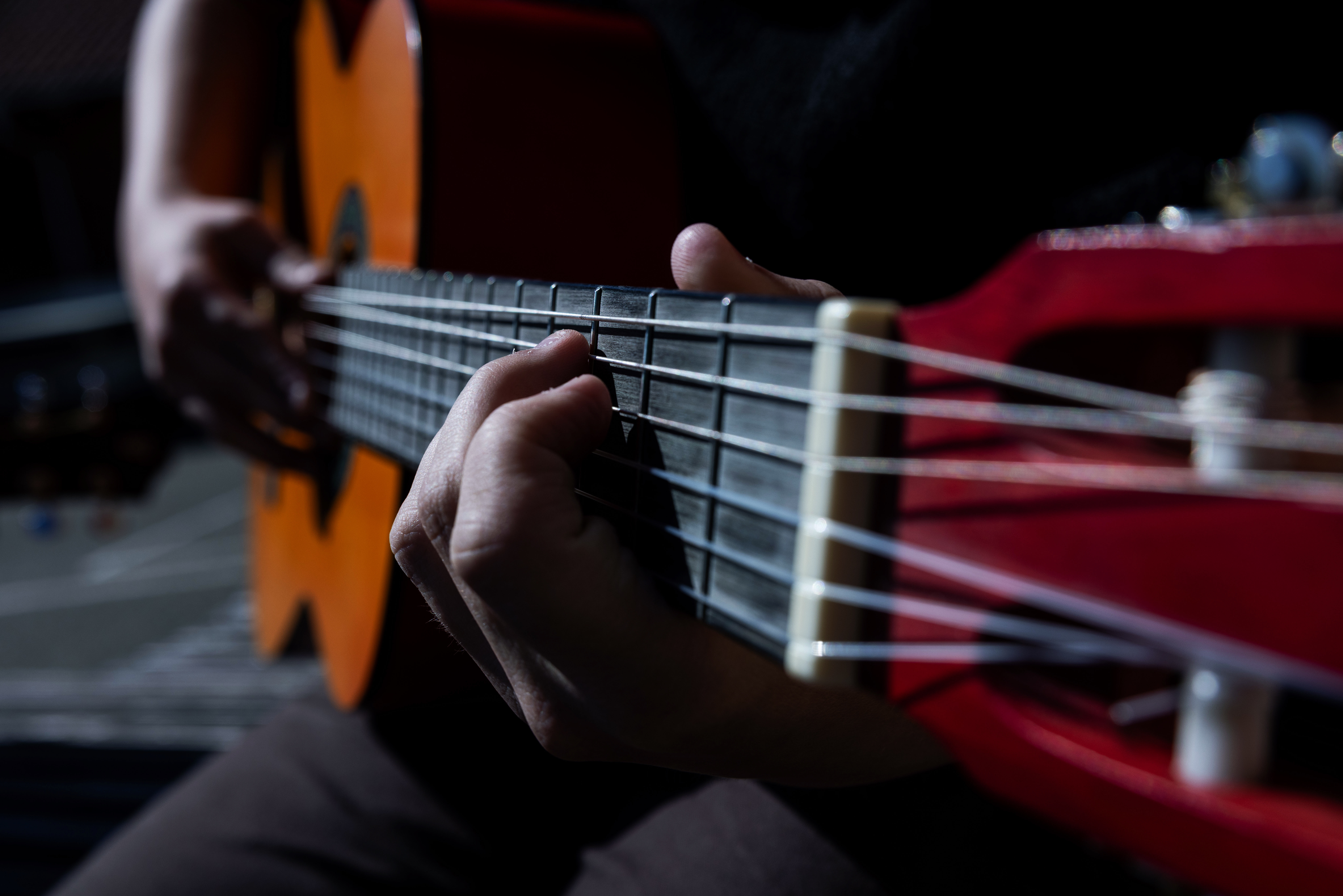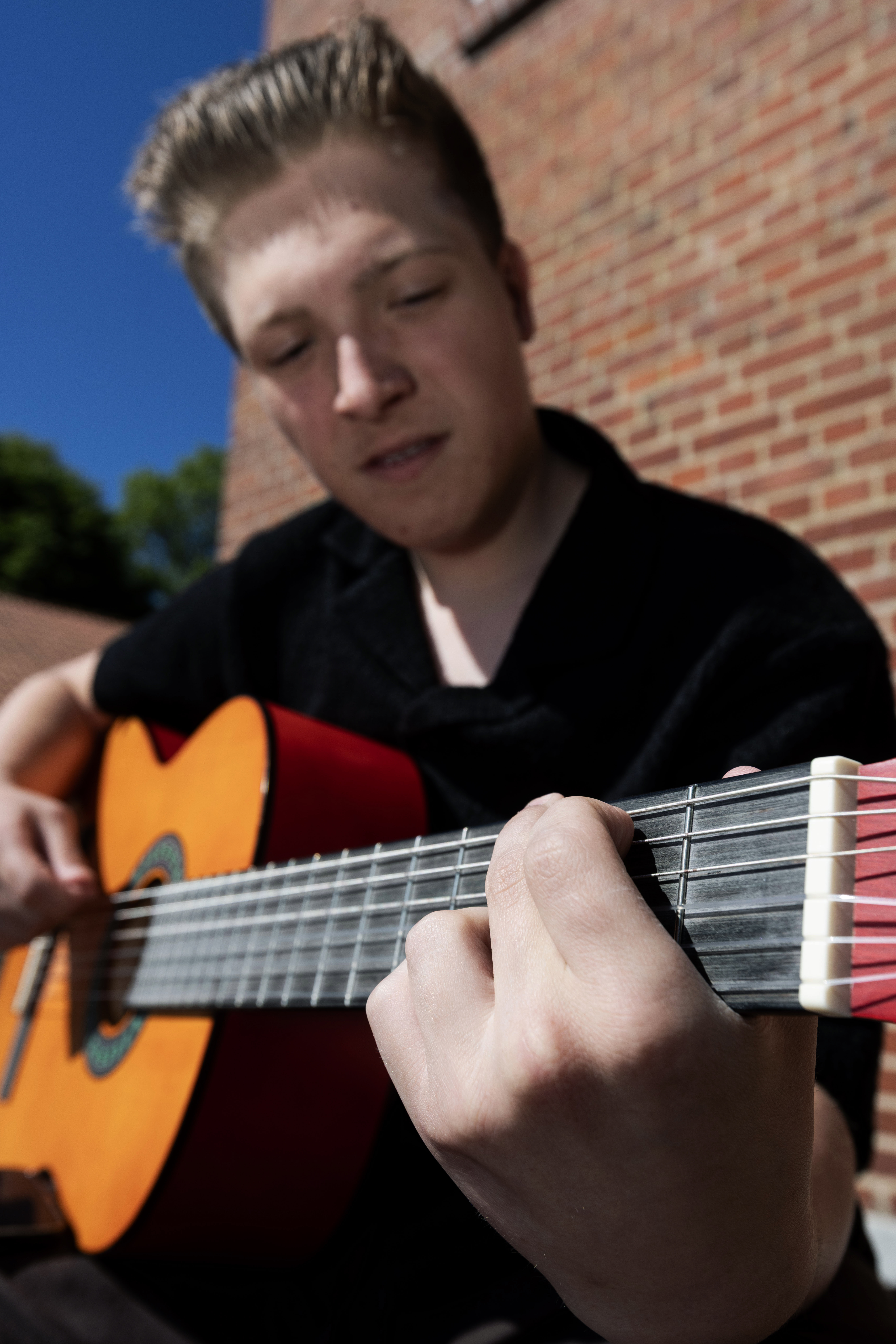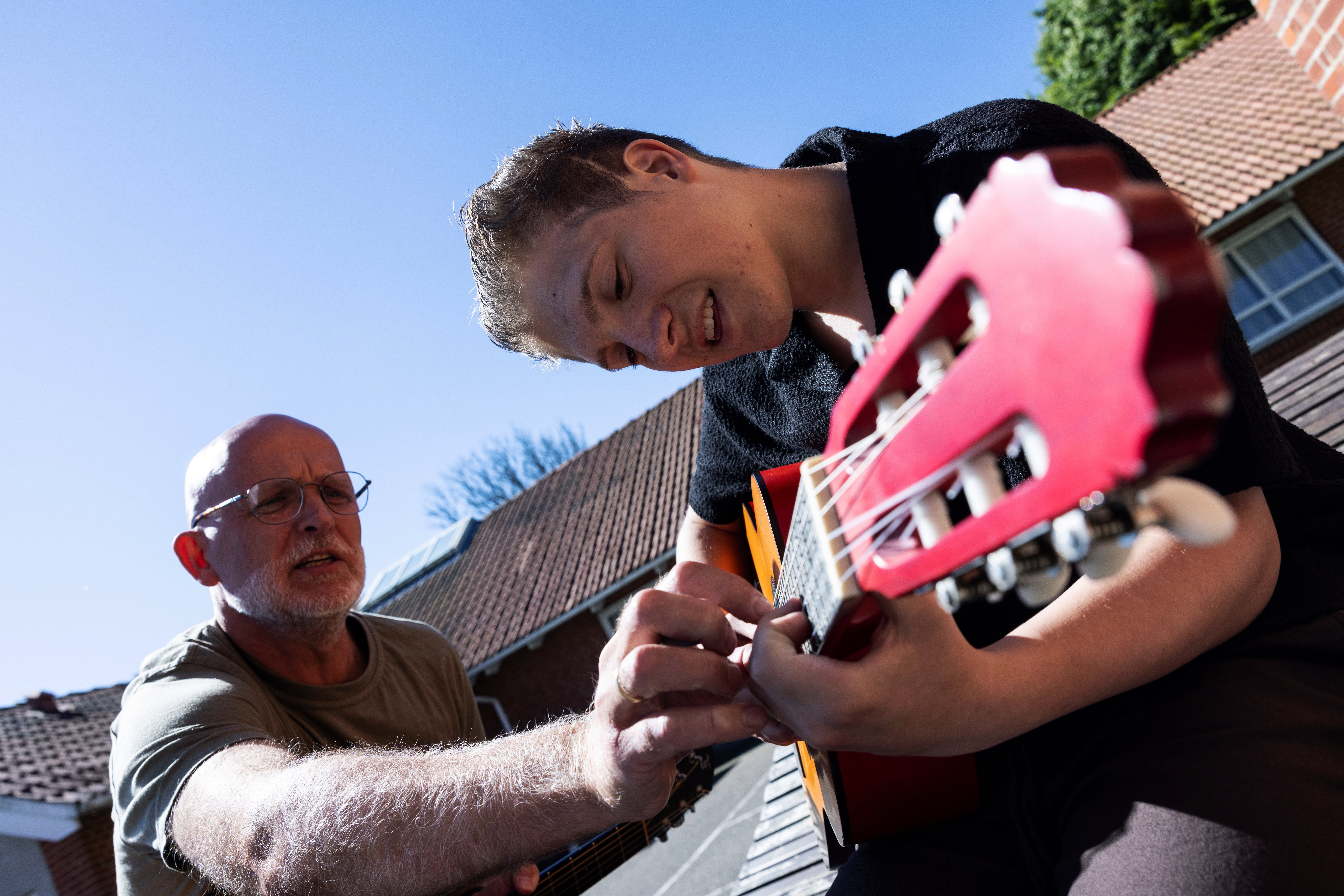 Vi lærer at spille guitar sammen i fællesskab. Vi arbejder med akkorder og rytmer, og du kan være med uanset dit niveau. Du behøver nemlig ikke at have spillet før, for vi tager udgangspunkt i, hvad du kan, og bygger på.